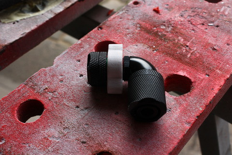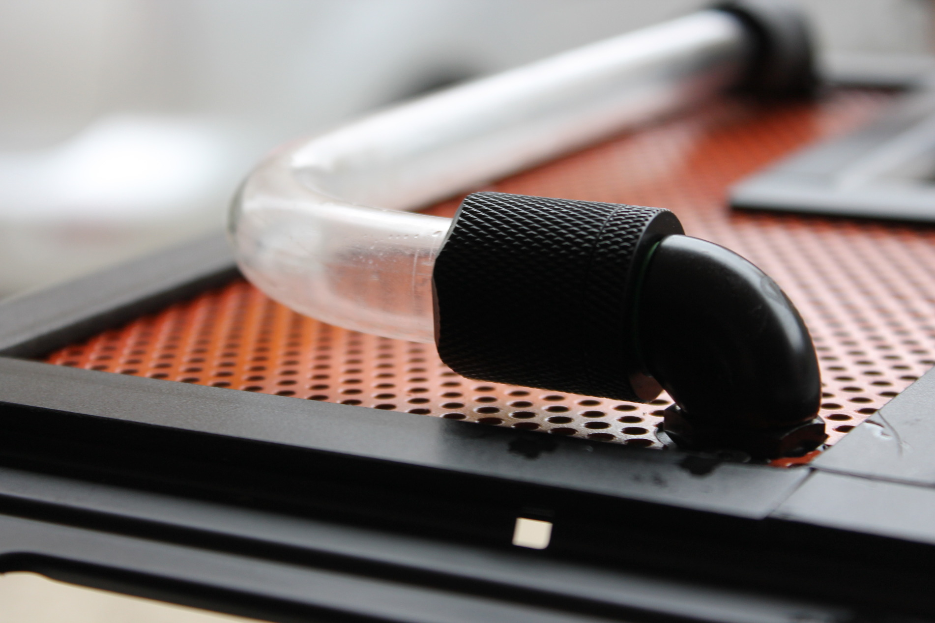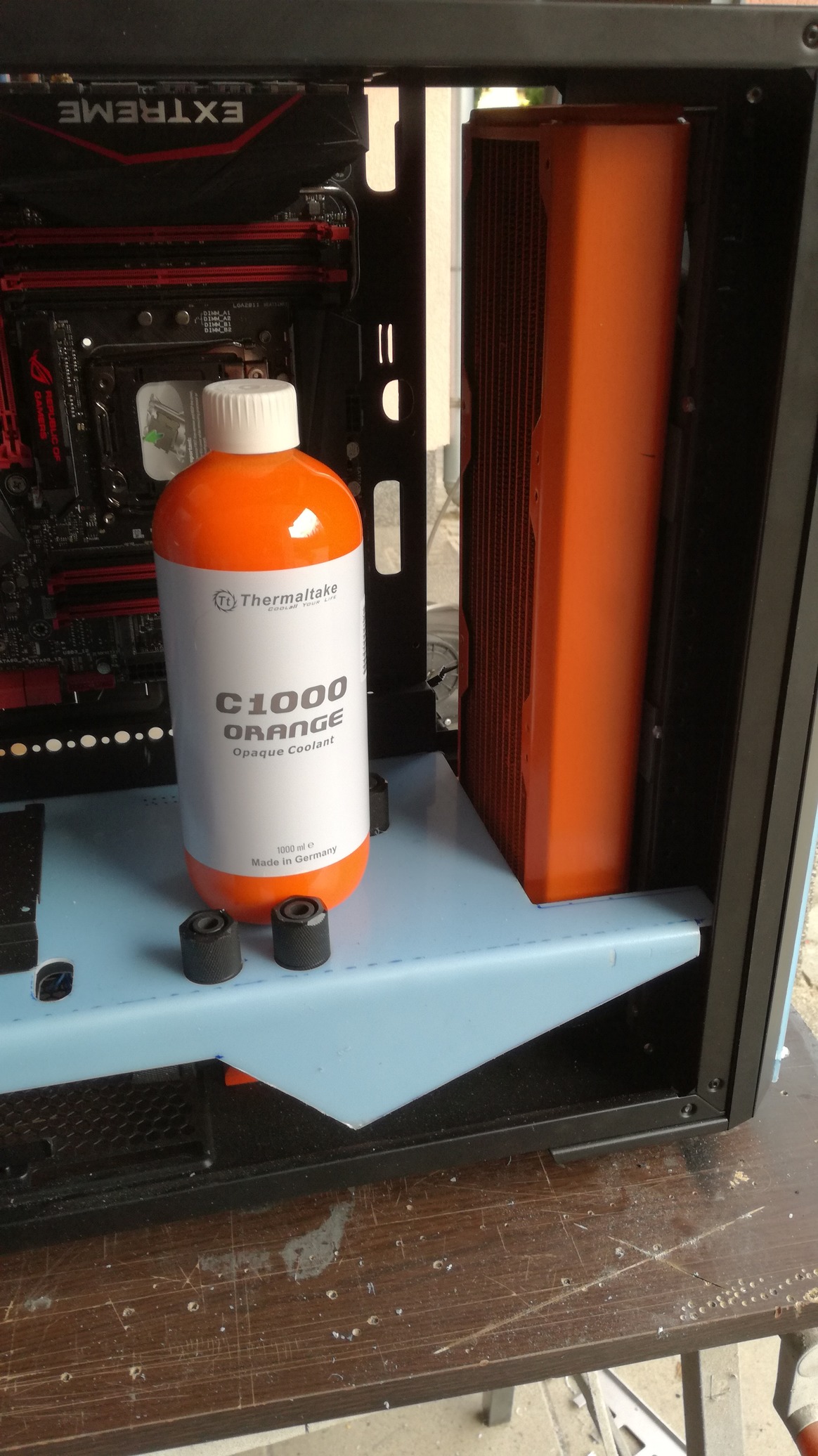 Ismét az a fejezet következik, ami engem leginkább megmozgat minden házépítés során, ez pedig a vízhűtés. Az első fejezetben említettem, hogy a Nanoxia cégtől kaptam ehhez a munkámhoz világító csatlakozókat, így egy picit próbáltam több mindent beletenni a kinézetbe, mintsem egy relatíve egyszerűnek mondható kivitelezést. Az egész ház színek meghatározásában a fekete - fehér, igen nem és narancssárga színek dominálnak, ennek megfelelően a folyadék sem lehetett más választás . Próbáltam natúr átlátszó folyadékkal, de a LED-ek fényei nem igazán érvényesültek.