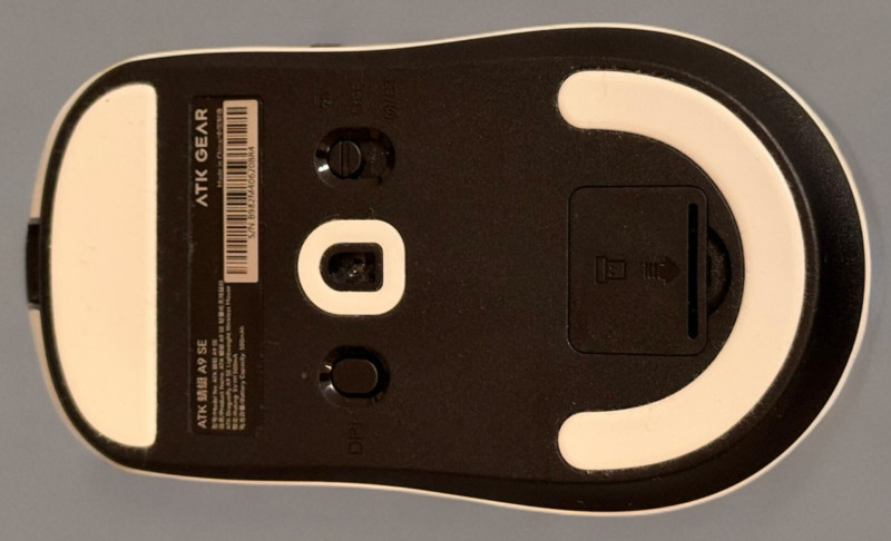 Az egér alján teljes méretű PTFE tappancsok találhatók, amelyek jól siklanak a padon. Az alsó rész letisztult, csak a szükséges kapcsolók találhatók rajta (on/off, DPI váltó).