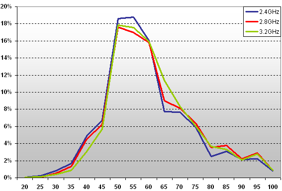 A benchmark saját maga is szép grafikont készít, az idő függvényében ábrázolja az fps-t. Nem látható nagy eltérés a három grafikon között. Jobban megnézve már akad pár apró, de fontos eltérés. A 2.4GHz-es görbén több negatív tüske is megfigyelhető. A középső (2.8GHz-es) grafikon sokkal "simább", a 3.2GHz-es verzión pedig tovább csökken ezek nagysága.