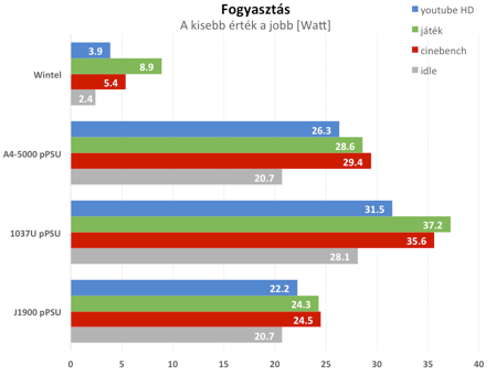 Arra számítottam, hogy a tabletbe szánt Atom SoC-kal a Wintel gépecske fogyasztása minimális lesz. Ez be is jött. Windows alatt csak 2.4W-ot mértem idle állapotban. YouTube lejátszás közben 4W alatt marad és teljes CPU terhelésnél (cinebench) is csak 5.4W-ot eszik. Ez szerintem fantasztikus érték. Legtöbbet játék közben eszik, pillanatokra 10W-ig is felugrik, de átlagban 8.9W-ot mértem, amíg meg nem közelítette a 90 Celsius fokot. Onnan folyamatosan ugrált durván 5 és 9W között. Ezeknek az értékeknek a többszörösét fogyasztja az asztali J1900, ami már így is alacsony fogyasztásúnak számít. Ha CPU/IGP teljesítményt nézzük, akkor nagyon jó a hatásfoka a gépnek.