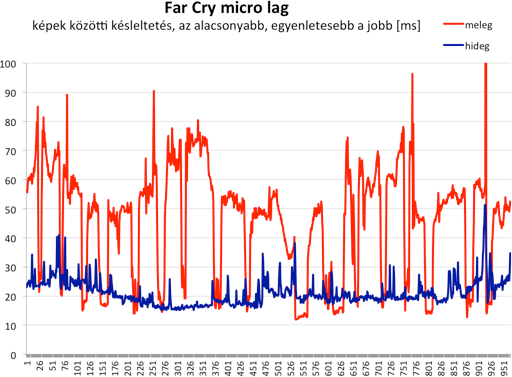 Far Cry alatt 26% a hideg és meleg minimumok között a különbség, de ez messze nem adja vissza, amit játék közben tapasztaltam. Amikor bemelegszik a gép, akkor nem szimplán lassan fut a játék, hanem néha meg-meg lódul, majd ismét belassul. Ez sokkal zavaróbb, mintha folyamatosan alacsony lenne az fps.
