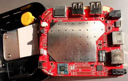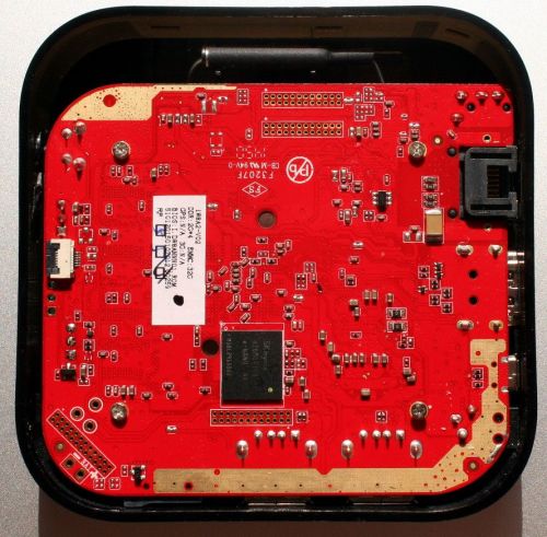 A másik oldalon jött a meglepetés. A Realtek hálózati chipek, az antenna és az IR szenzor is jól felismerhetőek és az elektronika többi részében sincs semmi szokatlan. A fémlap és a ház teteje között viszont várt még valami, amit hűtésnek gondoltak.