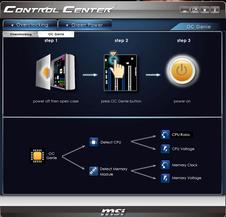 Tulajdonképpen egy gyári tuningot állít be azoknak akik nem akarnak matatni a beállítások között de azért szeretnének némi teljesítménytöbblethez jutni. Ehhez nem kell mást tenni mint az alaplap jobb alsó sarkában a bekapcsoló és újraindító gomb mellet megnyomni (kikapcsolt állapotban) az "OC GENIE II " feliratú gombot. És máris 4200Mhz-n jár processzorunk. Ezen funkcióról a "tuning" részben részletesebben is foglalkozom majd.