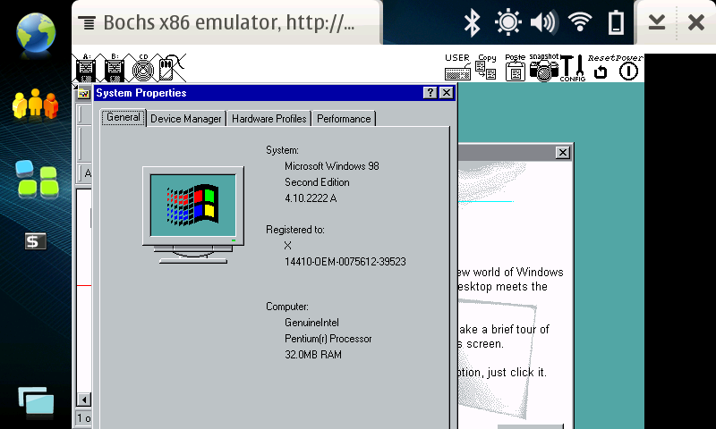 Ezeket a gondokat leszámítva a bochs stabilan futtatta a Win98-at. Ha kéznél lett volna egy N810, akkor a billentyűzettel könnyebb dolgom lett volna. Szerencsére a négy kurzormozgató és az enter működött, ráadásként a user inputra is megadtam egy billetyű kombinációt.