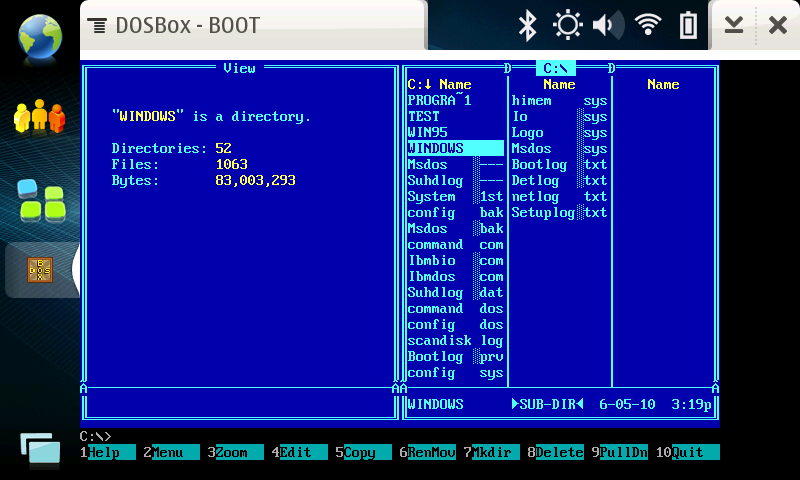 Az dosboxot próbáltam ki utoljára. Mivel az előző két emulátornál már tisztán kiderült, hogy a Windows értelmes sebességgel nem futtatható, ezért gondoltam maradok a DOS-nál. Kicsit utána olvastam és több helyen is emlegették a Windows 95 támogatást. A telepítés nem volt nehéz, bár pár kört futni kellett, mire minden a helyére került. A billetyűzet hiánya már nem okozott gondot, mert a qemu-ból tanulva felraktam egy vnc szervert. Az emuláció sebességétől viszont ennél az emunál sem voltam elájulva. Nagyjából fél óra alatt indult el a rendszer és minden egyes ablak megnyitása fél-egy perces homokórázást jelentett.