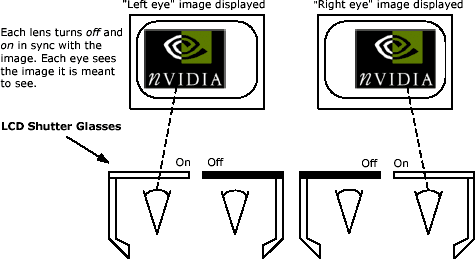Az aktív shutter lényege, hogy a vga egyszerre két képet alkot és a monitor hol az egyiket hol a másikat jeleníti meg. Itt jön be a szemüveg létfontossága, ugyanis az egyik szembe csak az egyik képet a másikba pedig a másikat engedi. Ezt képzeljük el úgy, hogy van egy "A" és egy "B" képünk. Abban a pillanatban amikor az "A" kép van a monitoron, a szemüveg bal lencséje sötétül el, amikor pedig a "B" van megjelenítés alatt, akkor pedig a bal, így biztosítva az, hogy egyszerre csak az egyik szemünk az egyik képet lássa. Ezért van szükség a 120Hz-re, mert ez ilyenkor feleződik és így az egyik szemünkre 60Hz jut.