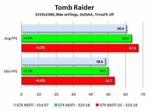 Az első teszt a lassan megszokottá váló 4-5% körüli előrelépést hozza, míg a TressFX használata mellett minimumok terén 7%, átlagok terén 11% az extra fps. Ez nem olyan sok, aminek valószínűleg az az oka, hogy a 314.07 is tartalmazott Tomb Raider optimalizációt - viszont a játék sebessége pont abban a tartományban van, ahol a "nem egészen játszható" és az "éppencsak játszható" elválik egymástól, ezért a realisztikus(abb) haj kedvelőinek a 320.18-as meghajtó által szállított sebességnövekedés is jól jön.