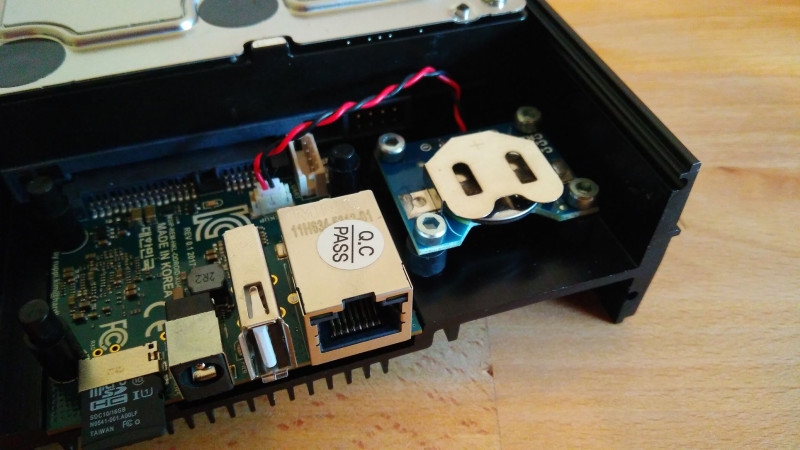 Kiegészítőként számos kütyüt választhatunk, van itt USB-Wifi modul, GPS egység, RTC battery, USB-UART soros port illesztő, kábelek. Ezek közül az RTC battery-nek képzeltem el fix helyet, igaz nem a gyári kialakításban. Kétpines csatlakozót találtam itthon, a holdert ebay-ról szereztem be. A fúró már kéznél volt ugye, így a furatok és menetek elkészítésével a végeredmény egy rögzített foglalat, cserélhető elemmel. Funkcióját tekintve a real-time-clock egységet, vagyis fedélzeti órát tartja életben 3 V-ról amikor a board kikapcsolt állapotban van. Ennek hiányában a készülék csak az NTP szerverekre hagyatkozhat a pontos idő megállapításakor.