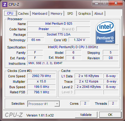 A D 925 gyakorlatilag két Netburst (Pentium 4), még pontosabban Cedar Mill magot rejt a kupak alatt magonként 2 MB level 2 cache-sel. A 65 nm gyártástechnológia, 3 GHz-es órajel, SSE3 és x64 támogatás is jól hangzik és a 95 W-os fogyasztás sem volt sok a régebbi Smithfield szériához képest. Érdekes, hogy a két mag nem egy chipen van, csak a tokozásnál találkoznak. Ez elvileg negatívan hat a teljesítményre, de egy csak HT-vel rendelkező P4-et már az első kattintásoknál érezhetően csúnyán elver.