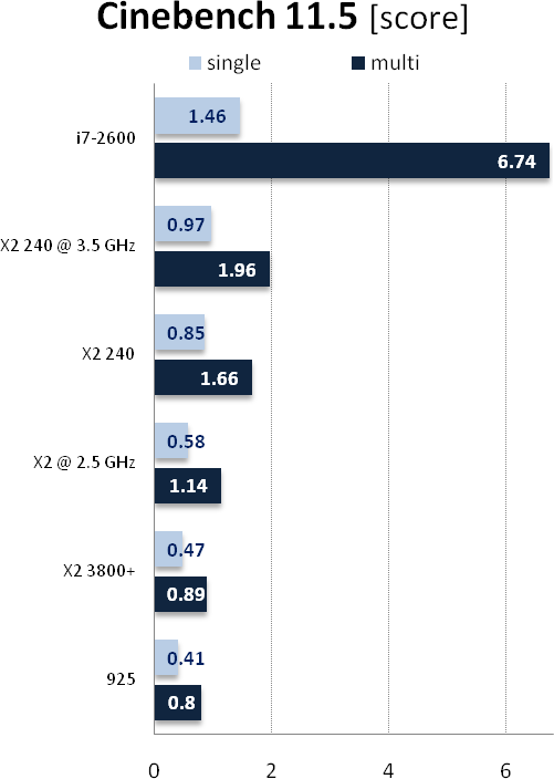 A CPU-k teljesítményét Cinebench segítségével próbáltam nagyjából felmérni. Az igazi az lett volna, ha további teszteket is futtatok, de így is látszik, hogy a Pentium D órajele hiába jóval nagyobb, mint az X2 3800 mégsem gyorsabb, de gyakorlatilag egy kategória a kettő. Az Athlon II már jóval többet tud, mint a két öreg, de a tesztekben is külön fog szerepelni.