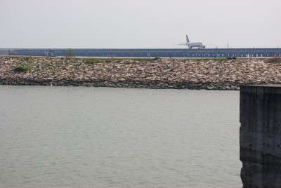 A kikötő mellett a reptér, a kifutópálya lényegében a vízre van építve.