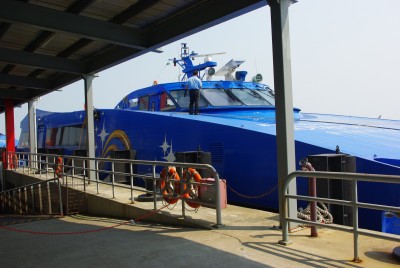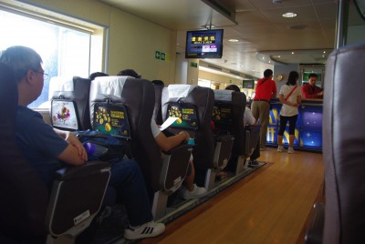 A hajóterminál körülbelül olyan belülről, mint egy reptér, úgy is működik, kivéve, hogy nincs szigorú poggyászvizsgálat. Check-in, konkrét helyre szóló jegy, útlevélellenőrzés, folyosók, beléptetőkapu... És a hajó is olyan belülről, mint egy repülőgép. Úgy is megy! Gyorsan! (Előző blogbejegyzésben fotóztam menet közben ilyen hajókat.)