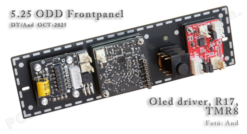 A cikk első képén látható előlap mögött a következő szendvicsszerkezet fogad bennünket. A 128x64-es OLED kijelző kapott egy saját drivert, hogy ne más elől egye a processzoridőt, ill. a karakterkészletek a tárhelyet, továbbá az infra-vevő is itt lakik. Mellette az R17 rotary, ami tulajdonképpen az agy funkcióját tölti be, ez ad jelfolyamot az OLED-nek és a relépanelek meghatóit is kezeli. Az agy az OLED nélkül is képes tájékoztatni a felhasználót a készülék állapotáról. A körsávban elhelyezett 17+1db LED információt ad a hangerőről, balanszról, kiválasztott bemeneti csatornáról, mute-ról, stb. Mindkét panel „zajos”, jobb, ha külön panelon van, messzebb kerülve az audio-lánctól. Mindezeken túl, egy 6.3-as füles aljzat, és a már régebben megismert Soft-On/Off timernek kellett helyet szorítanunk. Ezen kívül szeretnénk egy kulturált, olvasható, valamint tartós feliratozást is, ha már előlap a téma. Kb. ennyit enged meg az 5.25 optikai meghajtó szabványos előlapmérete. Korlátos, de el lehet rajta férni. Ennek a moduláris felépítésnek megvan az az előnye, hogy nem kell egyszerre mindent kitalálni és kifejleszteni, mint egy gyári kütyünél. Elég a külső méreteket egyenként jól megsaccolni. Nem utolsó sorban az egyes részelemek is könnyebben upgrade-elhetőek. De amit a legfontosabbnak vélek, hogy bármilyen ízlés szerint át lehet rendezni az egyes modulok pozícióit, nem vagyunk kötve egy fix sémához. Egyszóval DIY-barát!