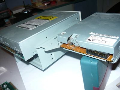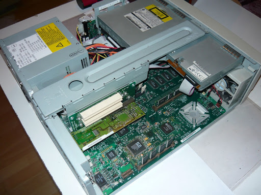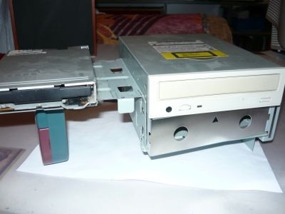 A floppy és a CD meghajtót egyben ki tudtam venni a tartóállványukkal együtt. A CD-olvasó 12x-es, ATA csatolós, Apple gyártmány, a floppy Mitshubishi, érdekessége, hogy nem a szokásos floppykábelje van, hanem egy 20 eres kábellel csatlakozik az alaplaphoz, és az áramot is ezen keresztül kapja.
