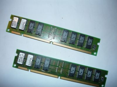 Nagyjából középen, de azért eltéveszthetetlenül a memóriák, három slot, elvileg SDRAMok (öcsém megszámolta: 168pin, tehát SD). A két foglalt slot egyébként Dual Bank felirattal van ellátva, a maradék egy alatt a Single Bank felirat olvasható. Talán valami Dual Channel-szerűség.