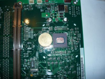 Alatta pár ismeretlen funkciójú dolog, alatta egy barna slot, illetve egynek a helye. A meglévő slot felirata Cache DIMM, itt még nincs a prociba integrálva az L2, ez megy bele: