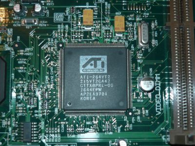 A bal alsó részt a videókártya uralja, melynek chipjén az ATi Technologies logó díszeleg, alatta pedig a cserélhető memóriájának slotja látható. A chip maga egy ATI Mach 64-es, sebességben valahol az S3 Trio64 körül vagy alatt van. (A chip beazonosítását köszönöm eziskamu kollégának.)