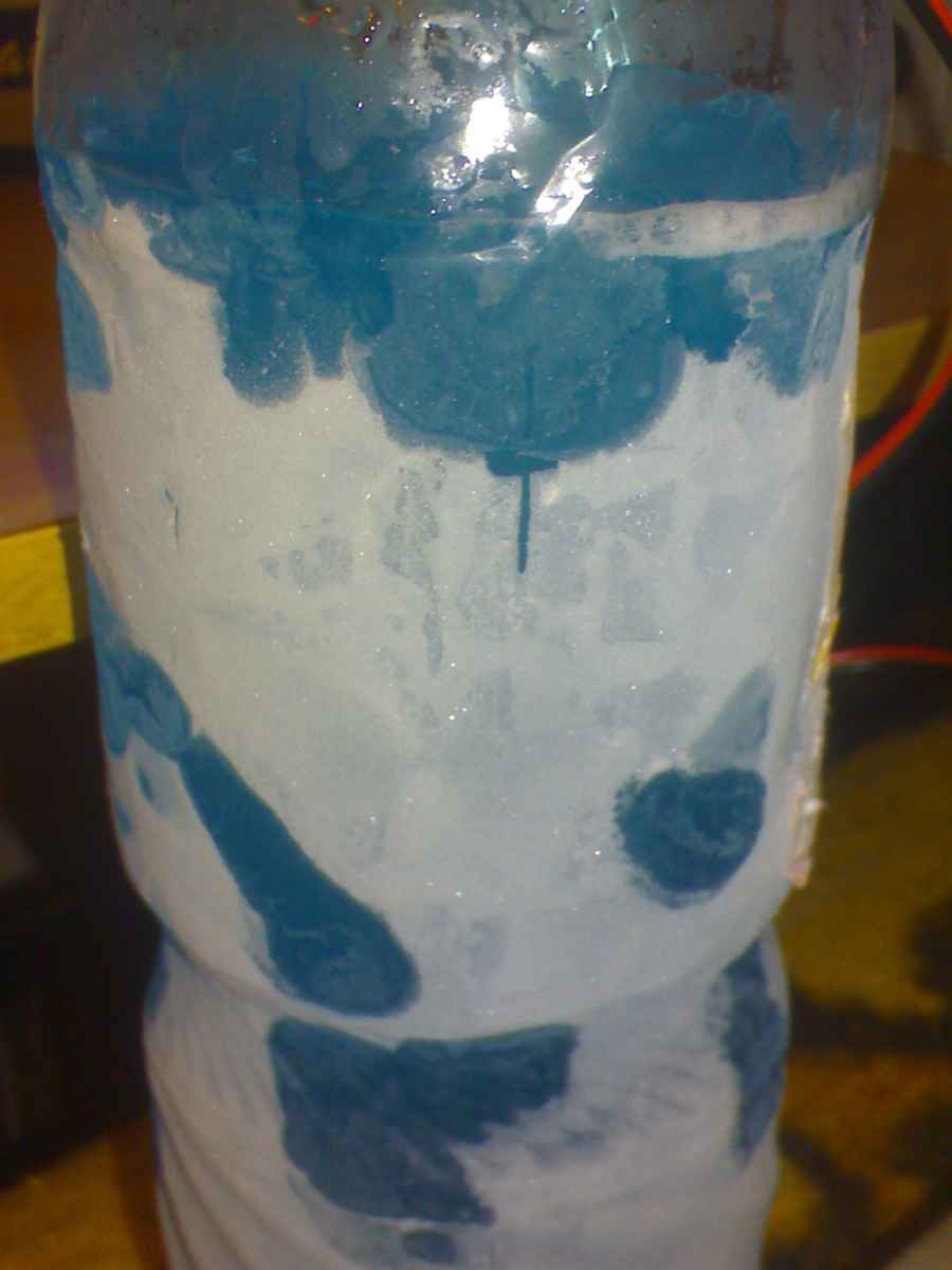Hogy ebbe mi a ráció?! Hát az, hogy mikor elkezd megfagyni a „hűtőkoktélunk”, a fagyálló nem fagy meg, folyékony marad annak ellenére, hogy hőmérséklete szép lassan bekúszik 0 fok alá. Közben a csapvíz pedig elkezd szépen jéggé, jégkásává alakulni! Figyelem, most jön a lényeg! Fizikából nem voltam soha jó (neeem, nem ez a lényeg) éppen ezért lehet, hogy nem jól magyarázom, de akkor majd értsétek jól! Szóval mikor kivesszük a hűtőfolyadékot a hűtőből, akkor a fagyálló továbbra is folyékony, míg a csapvíz jégkásává alakult át, s ha rákötjük a rendszerbe, akkor csak a fagyállót fogja keringetni a rendszer, a jeget nem, az nem kerül bele a rendszerbe. Mikor a fagyálló lehűti a CPU-t, majd mikor az enyhén felmelegedve visszakerül az üvegbe, akkor szépen rácsordogál az üvegben lévő jégre, így a jég egyből visszahűti, ezáltal míg van jég az üvegben, addig folyamatosan lehet tartani a 0 fok alatti hőmérsékletet fixen, s így elkerülhetjük, a folyamatos, lassú hűtőfolyadék felmelegedését, így több időt kapunk, a processzorunk kiteszteléséhez.