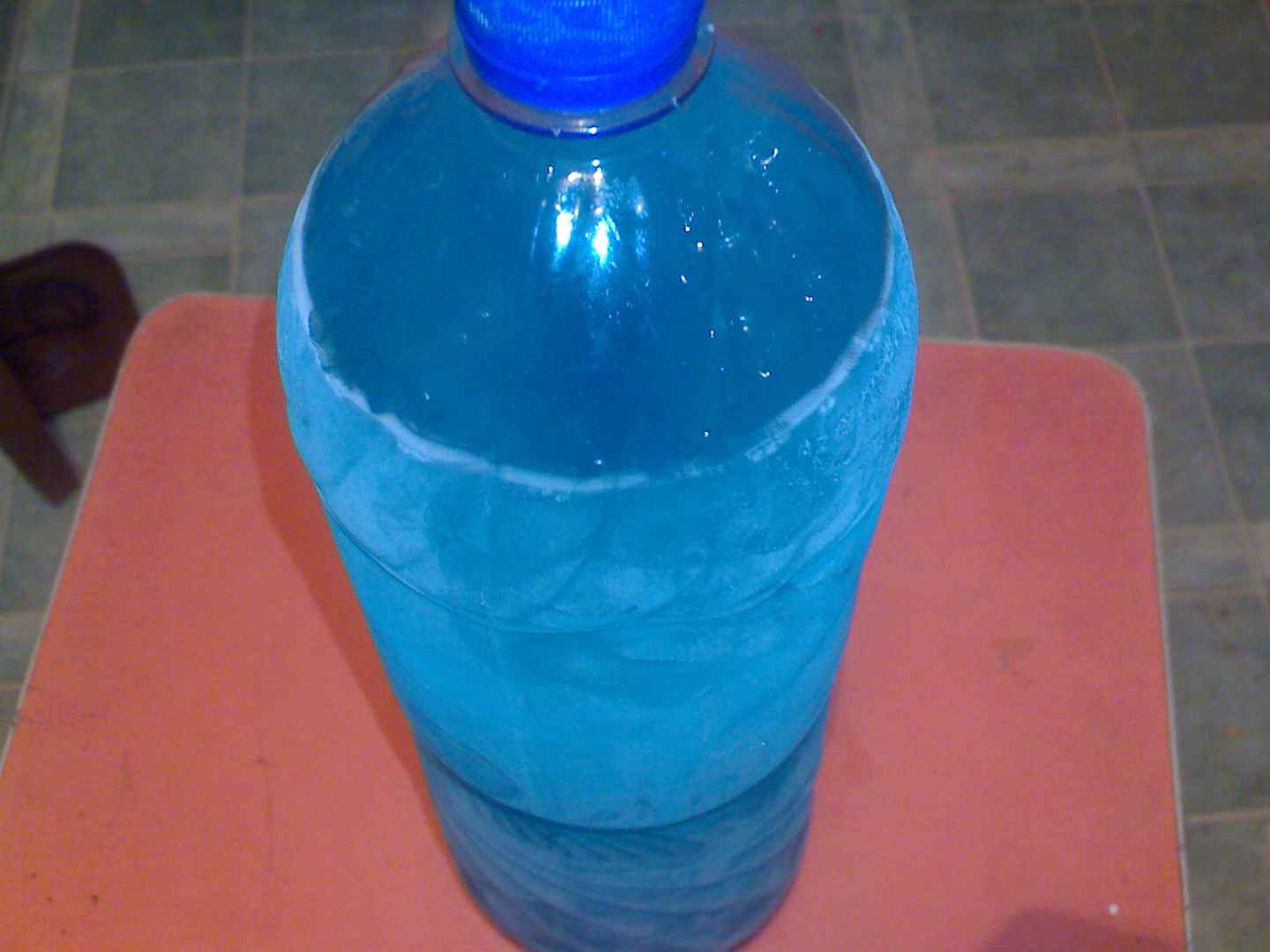 Miután meg vagyunk az előkészítéssel, azaz a lefagyasztással, vegyük ki a hűtőből! Figyelem, elsőre elég bizarr képet kapunk, azt a benyomást sugallhatja, mintha az egész kőkeménnyé fagyott! De nem, jó az! A víz benne jégkásás, a fagyálló pedig továbbra is folyékony, nem kell megijedni!