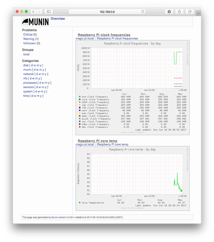 parancsok kiadása után lépnek életbe. Ezután már egy plusz “sensors” menüpont is a munin baloldali menüsorában, ahol a Pi órajelét, és hőmérsékletét követhetjük nyomon.