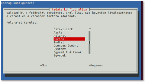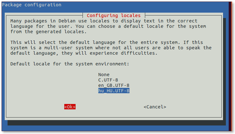 Az alapértelmezett nyelvet és karakterkódolást módosítja. Alap esetben ez az en_GB.UTF-8 UTF-8. Van aki az angolt preferálja, van aki a magyart szereti. Én jobban kedvelem a magyart, ezért a SZÓKÖZzel teszek egy csillagot a hu_HU.UTF-8 UTF-8 elé. A következő képernyőn ki kell jelölni, hogy hozzáadott beállítások közül melyik legyen az alapértelmezett.