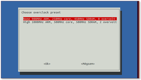 A tuningosok menüpontja. Ha kellene még egy kis plusz teljesítmény, itt megkaphatod. Fontos!!! A túlhajtás csökkentheti a Raspberry Pi élettartamát. Ha a megadott órajelen bizonytalanná válik a rendszer, próbálj meg egy szerényebb órajelet beállítani, vagy állítsd vissza az alapértelmezett értékre. A rendszer indulásakor lenyomva tartott SHIFT gomb ignorálja ezt a beállítást, az alapértelmezett gyári órajelen fog indulni.