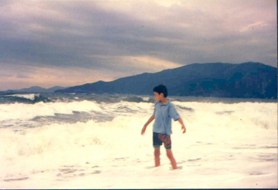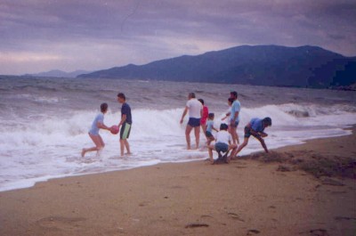 Miután berendezkedtünk, mi felnőttek egyen-kettenként leszállingóztunk a partra, vigyázni a gyerekekre, nehogy vizesek legyenek. A szél erősen fújt a tenger felől, magasra felcsapva a hullámokat, vízpermettel beterítve a parton állókat. A gyerekek beszaladgáltak a visszahúzódó vízbe, majd amikor jött a következő – néha méternél is magasabb - hullám, futás kifelé! Akinek sikerült a hullám előtt kiérni, futás közben az is összecsapta magát. Néhány percig próbáltuk tiltani a berohangálást, de aztán mi se bírtunk ellenállni. Mikor utolsóként Ibolya is leért a partra,már mindenki csurom víz volt. Először még mérges volt ránk, de ez csak addig tartott, amíg ő is a mi sorsunkra jutott. Remekül éreztük magunkat. Zoliék most találkoztak először a tengerrel, nekünk meg az tetszett nagyon, hogy nekik nagyon tetszik. Nekünk ugyan nem volt már újdonság, mégis boldogan rohangáltunk a nedves homokon, a felcsapódó víz elől nagyokat ugrálva. Felnőtt, gyerek, mindegy. Semmi különbség nem volt köztünk. Többnyire csak derékig áztunk el, de Zsófi tovább. Az ő ruhája nyakig lett vizes. Na, meg azon felül még a feje is.