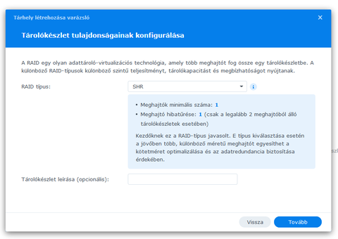Esetünkben, kettő merevlemezzel, a RAID1 vagy az SHR opció lesz az érdekes. Jelenleg mivel elérhető és kényelmes az SHR opciót választjuk, amely két meghajtó esetén lényegében RAID1 mintára működik ebből a szempontból. Természetesen további opciók is elérhetőek (RAID5 stb.), ellenben jelen esetben kettő lemezzel került tesztelésre a készülék, emiatt külön nincs említve.