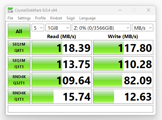A teljesítmény mérésére a Crystal Disk Mark lesz segítségünkre, az eszközben két Synology HAT5300-4T merevlemezzel.
