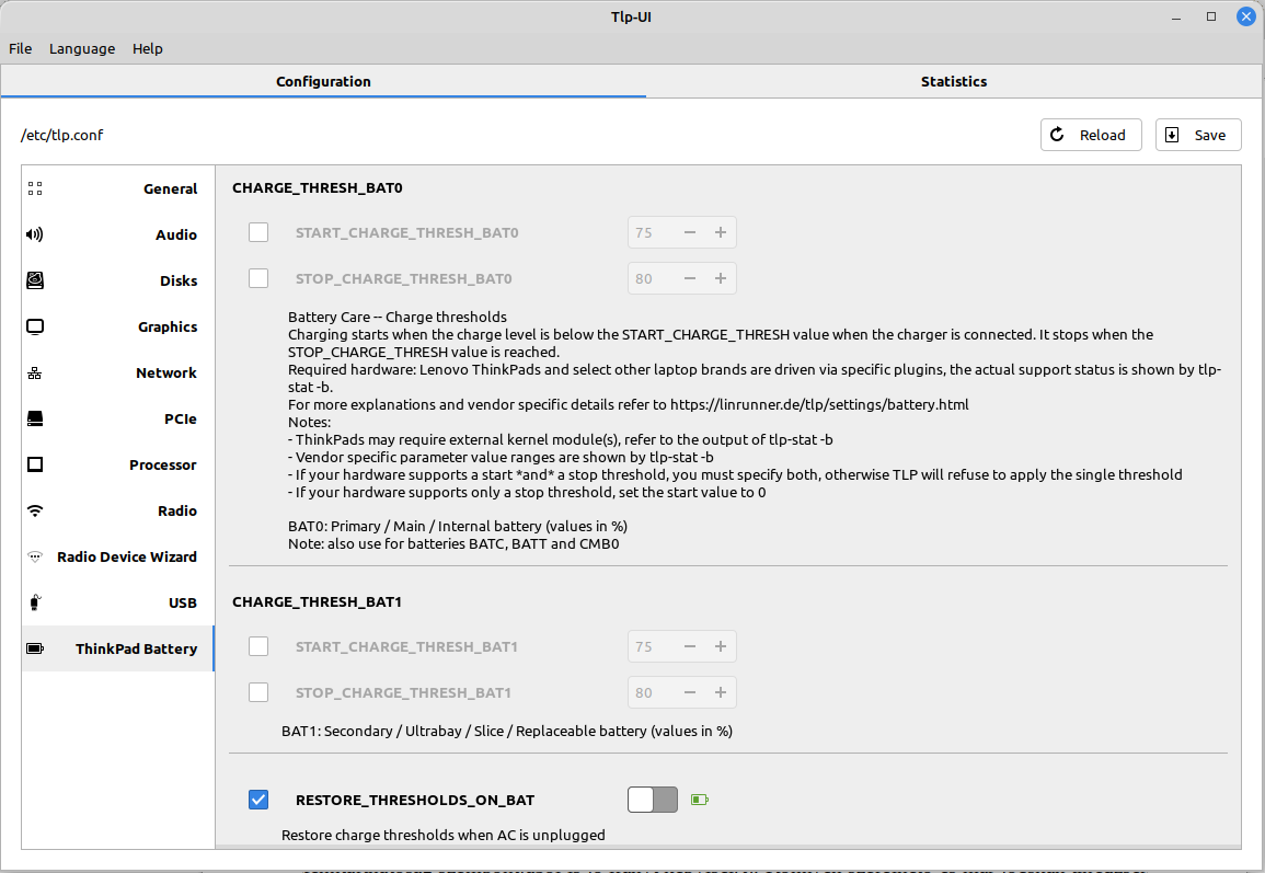 A TLP és a TLP UI Linux Mintben. Nem annyira menő kinézetre mint az eredeti ThinkVantage program, de hasonló szintű funkcionalitást kínál.