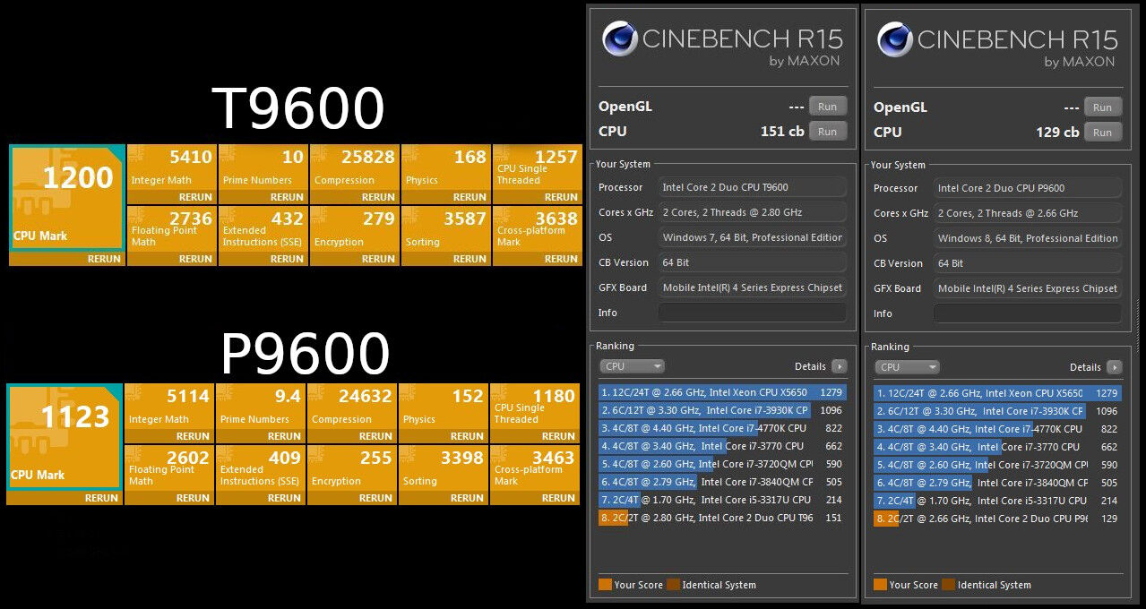 Igaz ezek szintetikus tesztek (Passmark, Cinebench R15), de mégiscsak adnak némi képet a két CPU közti különbségről. Nagyjából 8-10%-os teljesítmény-különbség van a két lapka között a T9600 javára.