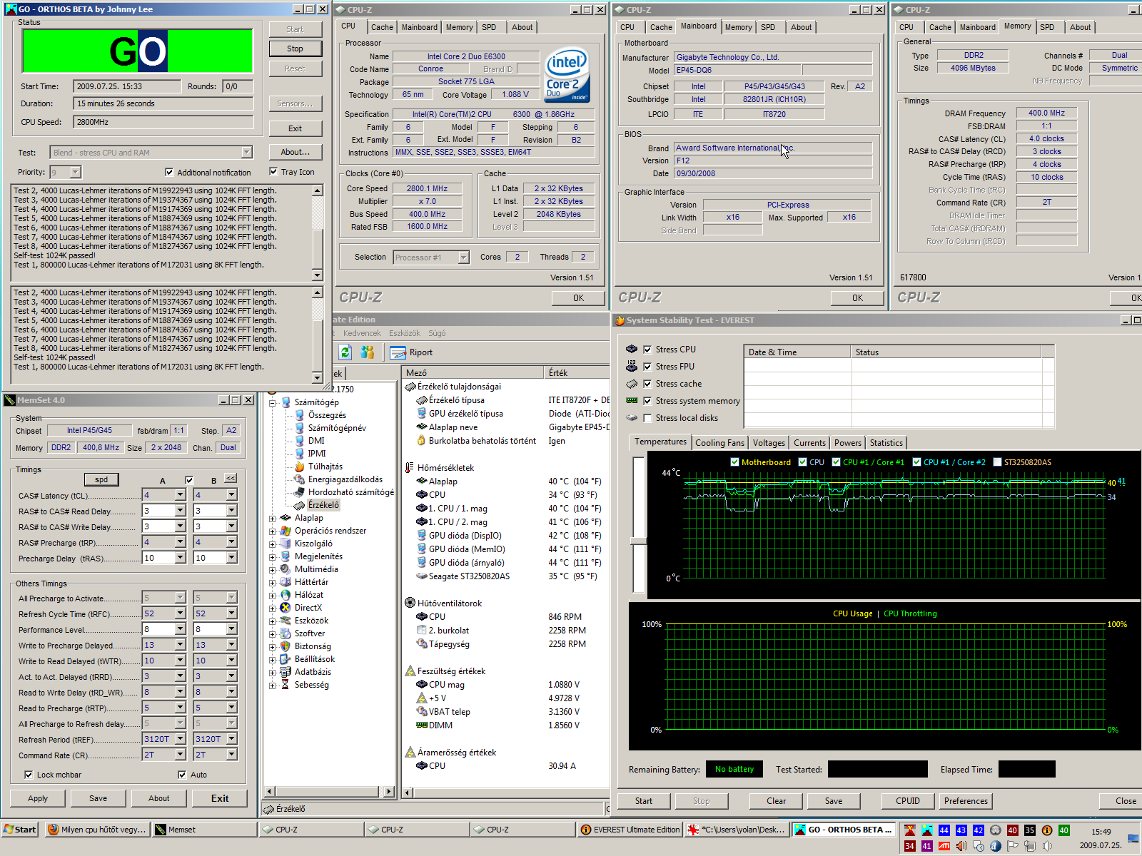 Miután az eddigi 1.8080v-on 3-4 perc után hibázott az Orthos, gondoltam egy kis plusz feszültséggel megbátorítom a ramot, így bios-ban 1.85-ös értéket kapott, ami ténylegesen terhelt állapotban 1.856-1.840 között változott. Így 15 percig kínoztam, majd inkább leállítottam, lusta voltam várni még 30-45 percet.
