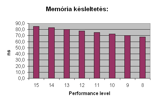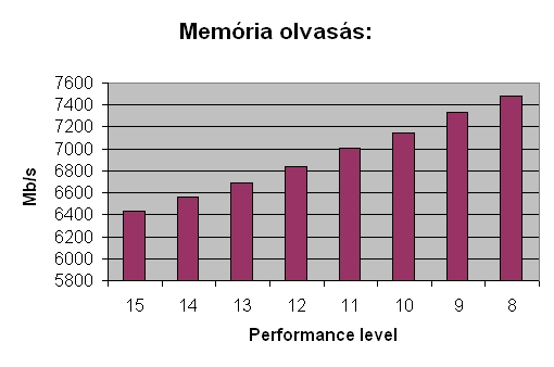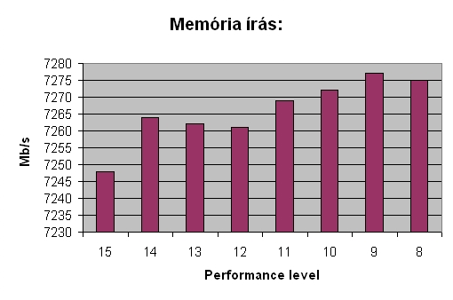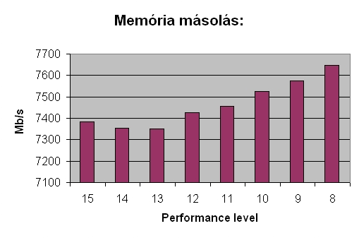 Memória olvasási, írási, másolási és késleltetési teszteket futtattam le a különböző Performance level-eken. A memória 800Mhz-en, CL4-4-4-12-es időzítésen, és 1.8080 volton üzemelt. Csakis a Performance level-t állítottam a mérések között.