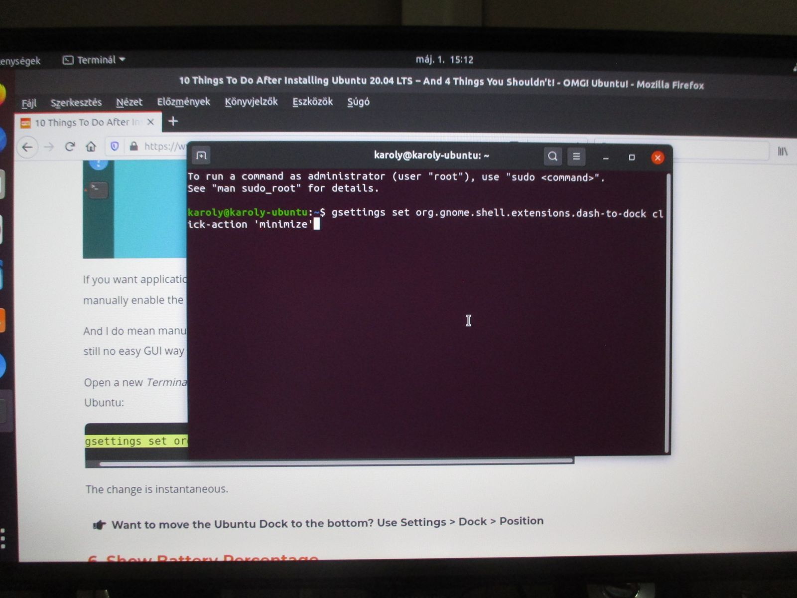 A következő tennivaló az, hogy engedélyezzük a tálcára való lekicsinyítést a tálcaikonra való kattintáskor. Na, és ez az a pont, amire azt tudtam mondani, hogy basszus, ezt miért nem tudja alapértelmezetten az Ubuntu 20.04 LTS? Ami egy olyan szinten triviális funkció, amit még egy "funkciócsökkentett" XFCE asztali környezet is tudja. Sőt, még az ősrégi Windows 95 és 98 is tudja ezt a funkciót. És hiába próbálnám a megnyitott ablakot lekicsinyíteni a tálcára a tálcaikonra való kattintáskor, nem fog történni az ég adta világon semmi. Na szóval, nyissunk egy terminált, és írjuk (másoljuk) be az alábbi képen látható parancsot: