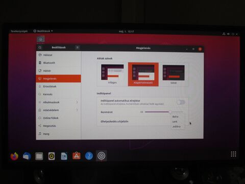 Az első dolog, hogy hogyan lehet a képernyő bal oldalán lévő dokkot letenni a képernyő aljára, mert a fogd és vidd módszerrel ez nem működik. Úgy hogy, szépen bemegyünk a beállításokba és a megjelenésnél szépen megkeressük az elhelyezkedés a kijelzőn opciót. Itt három opció áll rendelkezésre: balra, lent és jobbra. Rendben, akkor válasszuk ki a lent opciót. Nagyon jó.