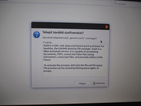 A GNOME Tweak Tool után jöhet a GNOME Sushi telepítése. Ez egy előnézet megjelenítő eszköz a GNOME asztali felülethez. Ezt is gyorsan telepítsük fel a gyorslink segítségével.