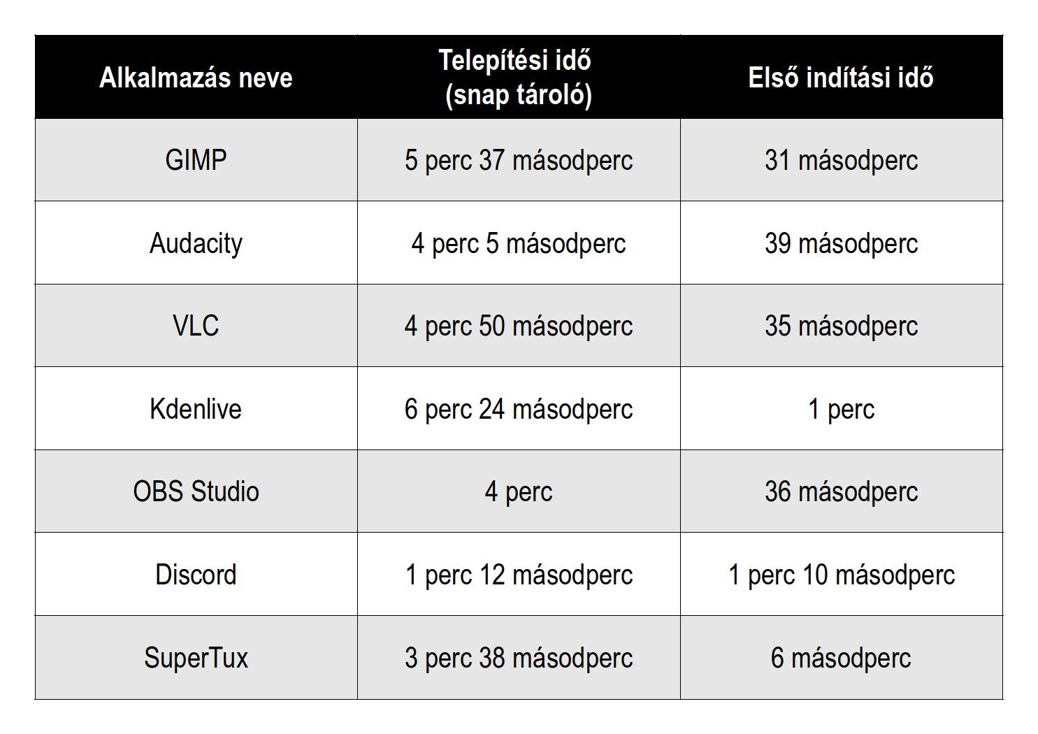 Ahogy a fentiekből is látszik, a Snap tárolóból történő alkalmazásoknak a telepítési idejük szinte kritikán aluliak voltak. Kdenlive telepítési ideje közel 6 és fél percig tartott. A Gimp, az Audacity, a VLC és az OBS alkalmazások első indítási ideje fél perc körül volt. A Discord első indítási ideje majdnem annyi ideig tartott, mint a telepítése.