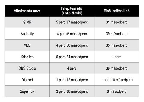 Most pedig jöhetnek a programok telepítése. Kíváncsi voltam arra, hogy mennyi ideig települnek bizonyos alkalmazások a Snap tárolóból az én méréseim szerint (stopperórával mérve). Illetve még azt is megnéztem, hogy mennyi ideig tart az első indítás.