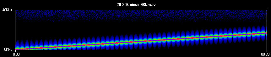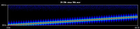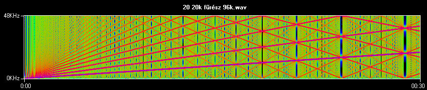 Így néz ki egy 20 – 20'000 között emelkedő szinusz spektrogram képe. Azért ér véget a félút alatt, mert 48 kHz-es felső határfrekvenciával dolgoztam.