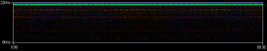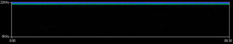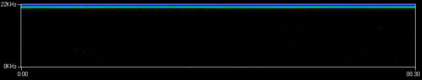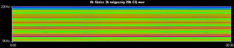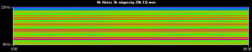 Az MP3 viszont nem így működik, hiszen első dolga, hogy 20 kHz fölött lényegében mindent eldob. Ezért az eredeti hanganyagból eltávolítottam ezen frekvencia fölötti összetevőket. Az alsót kaptam eredményül.