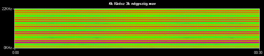 A tömörítő algoritmust azonban még nehezebb kihívás elé állítottam, mivel 4 kHz-es fűrészjel és 3 kHz-es négyszögjelből készítettem egy hangfájlt. Jelalakokból a harmadikról van szó, és alatta a spektro képe.