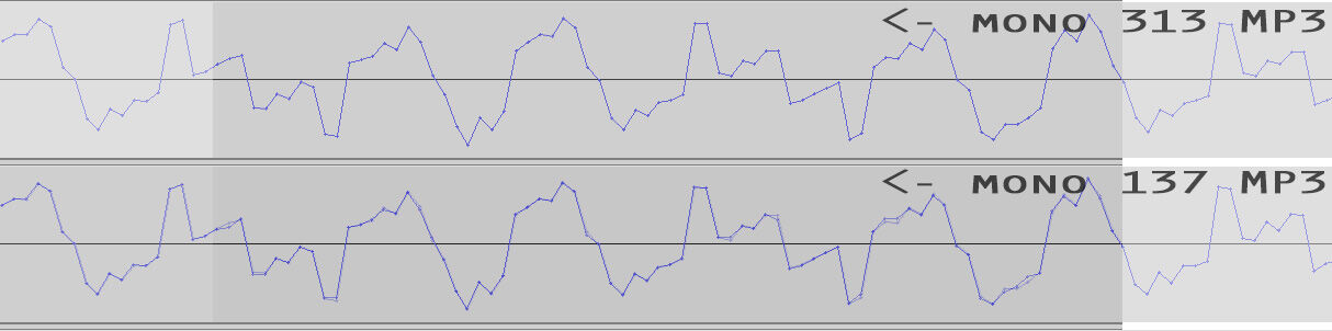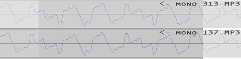 Az eredeti, monó jelről lévén szó, az MP3 esetén csatornánként adtam meg a bitrátát, tehát a "313 kbps" sztereóban a 640-es MP3 lenne.