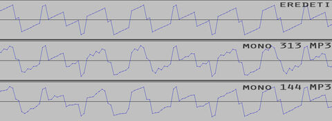 Ez az, amivel már érdemes ilyen jellegű összehasonlítást végezni. Balról a már csak 20 kHz alatti összetevőket tartalmazó eredeti, jobbról rajta a két fajta MP3.