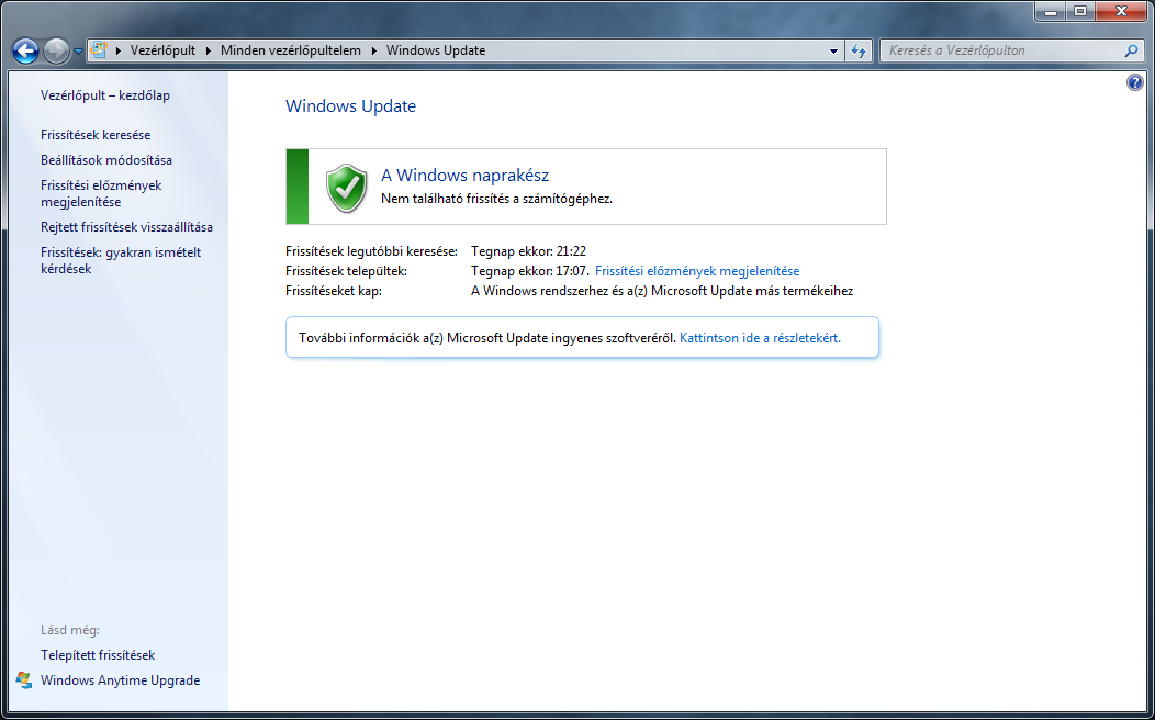 Ha feltelepültek a kijelölt frissítések, indítsuk újra a számítógépet. Ismételten térjünk vissza és keressünk újból rendelkezésre álló javításokat, majd telepítsük őket. Egészen addig tegyük ezt, amíg a következő kép nem fogad minket: