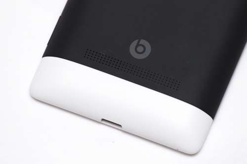 Felül a kamera amellett pedig egy LED villanó található, ami akár zseblámpa helyett is alkalmazható, ha nincs éppen más. Középen egy HTC logó az alatt pedig egy Beats Audio logó, ami alatt pedig a hangszóró van. A hangzás szép egy mobilhoz képest bár maximum hangerőn már kissé torzít.
