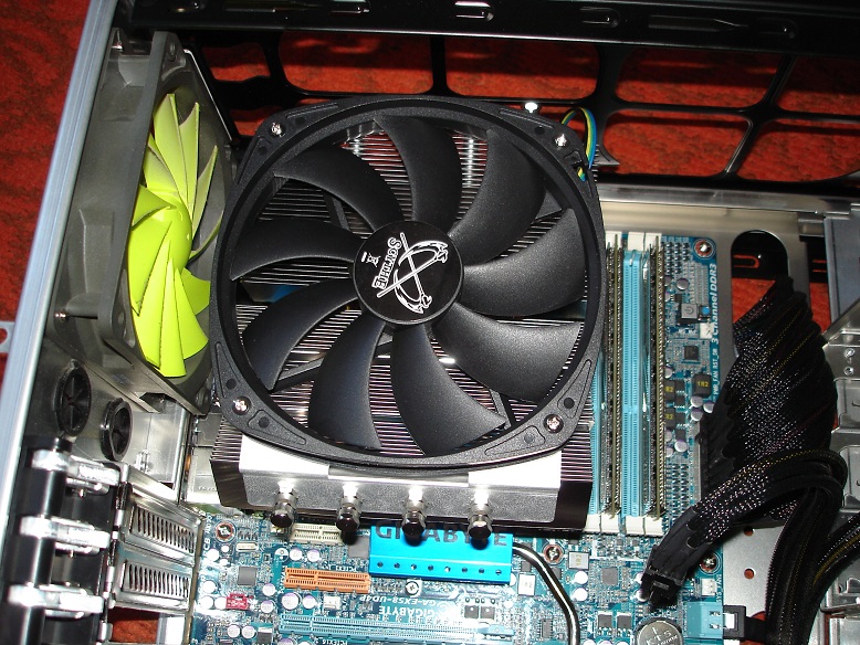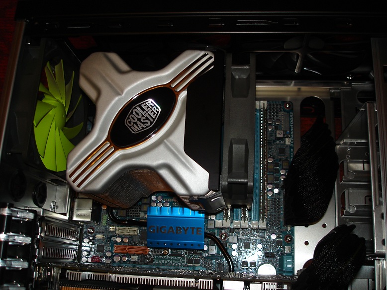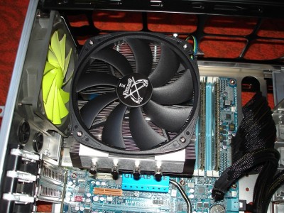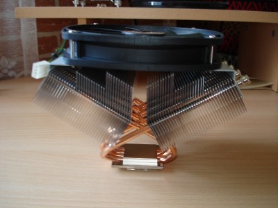 Majd egy kép a beszerelt állapotról. 90°-al elforgatva is felszerelhető a hűtő de én azért választottam ezt a megoldás mert így a hp vége nem ért bele a hátsó házhűtőbe + a lamellák úgy álltak, hogy az előről jövő légáramlat áthaladhat köztük és talán tovább javítja a szellőzését.