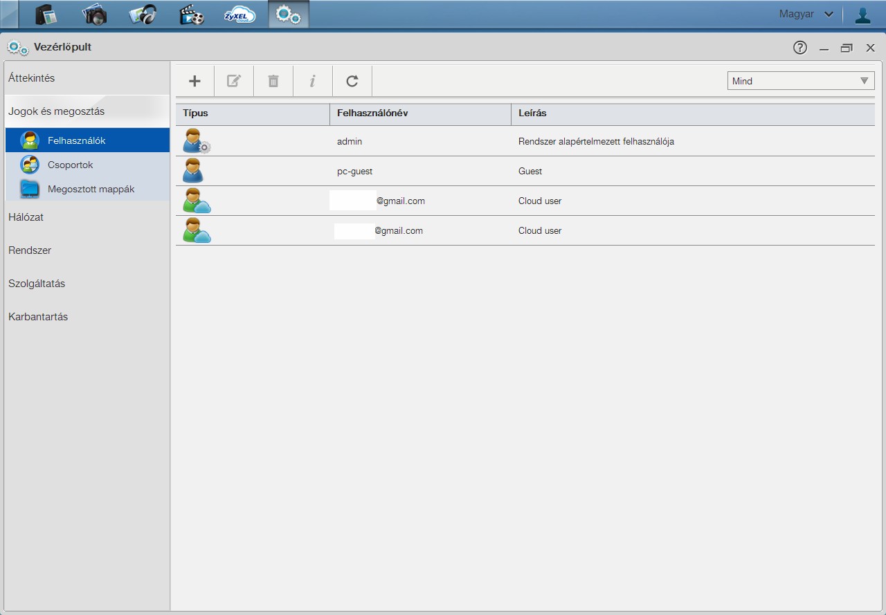 Itt tudjuk a felhasználókat hozzáadni és törölni. A ZyXEL Drive ( Android, IOS) alkalmazásból meghívottak cloud userként szerepelnek majd.