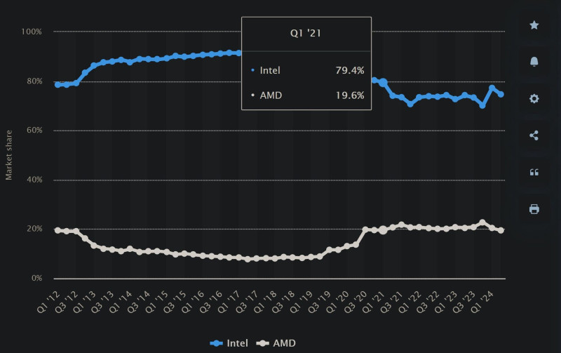 As of the fourth quarter of 2023, Intel was the biggest vendor in the PC GPU market worldwide, occupying 67 percent of the market. AMD occupied 15 percent of the market, while Nvidia took a market share of 18 percent.2024. ápr. 18.