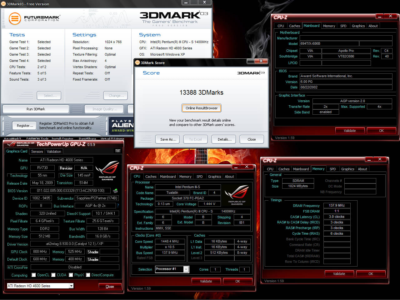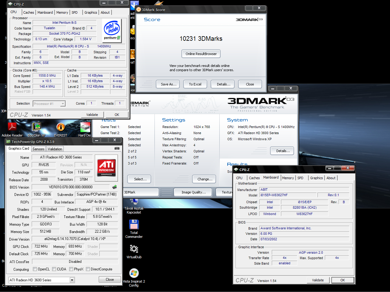 Ez a kép az előző alaplapban készült, ahol ment a 4X-es AGP, a processzor 150 MHz-el volt túlhajtva a másik eredményhez képest, a videokártya viszont alapórajelen ment, bár a túlhajtás szerepe a processzorlimit miatt csak játékokban és újabb 3DMarkokban jön elő (illetve a Catalyst régebbi, a kép módosításának dátuma alapján ez volt akkor a legfrissebb):