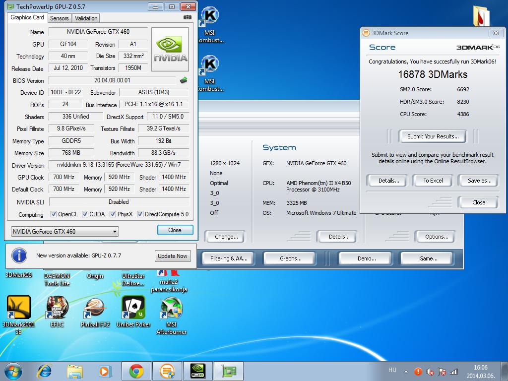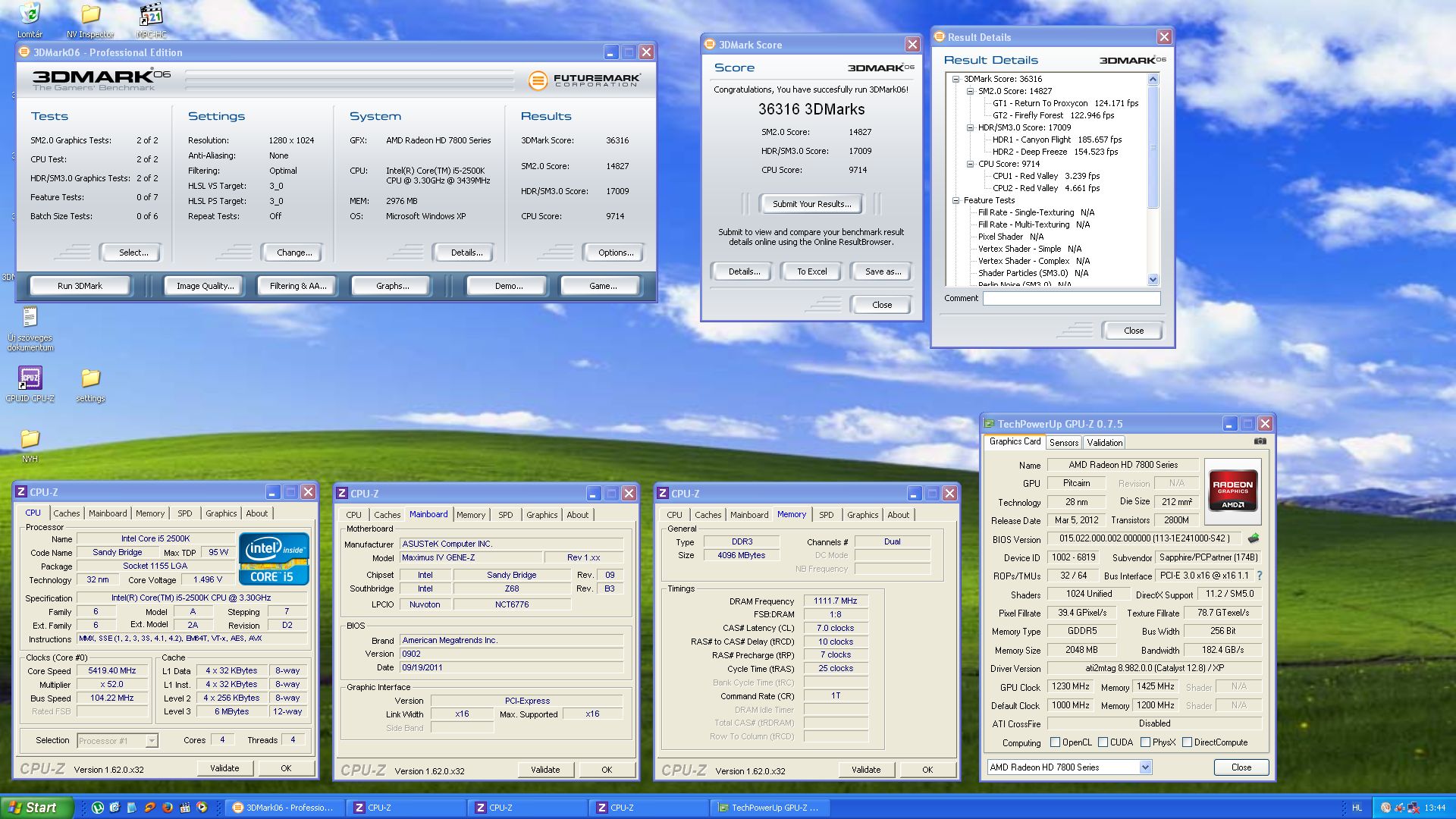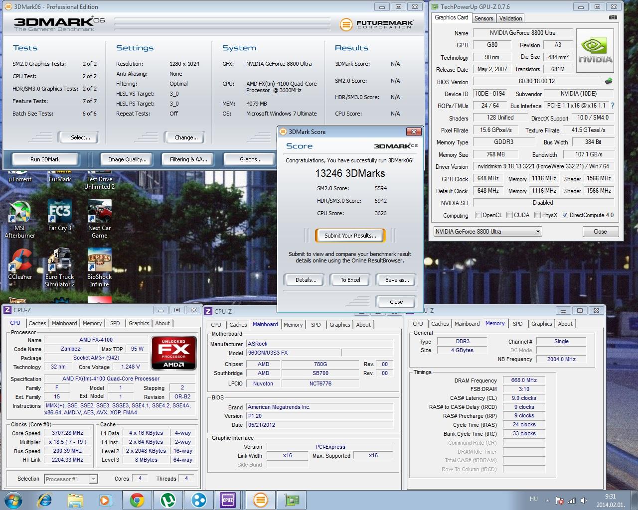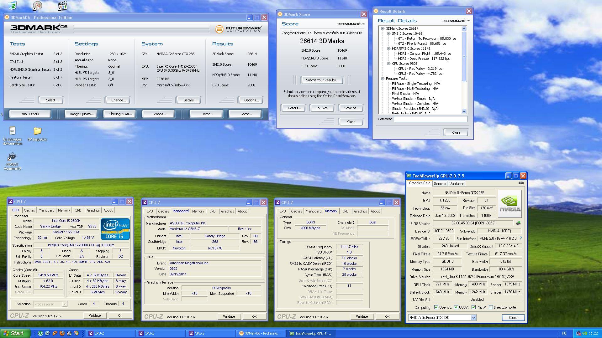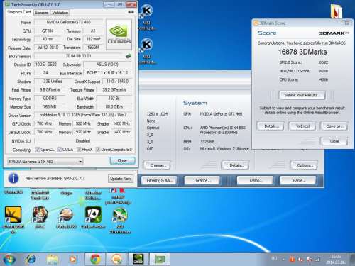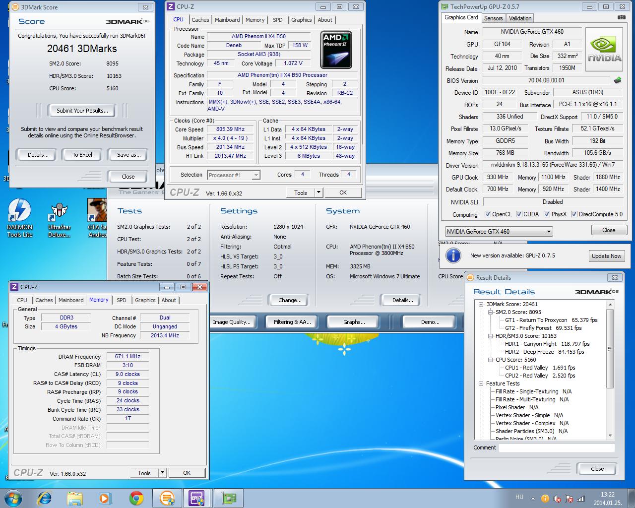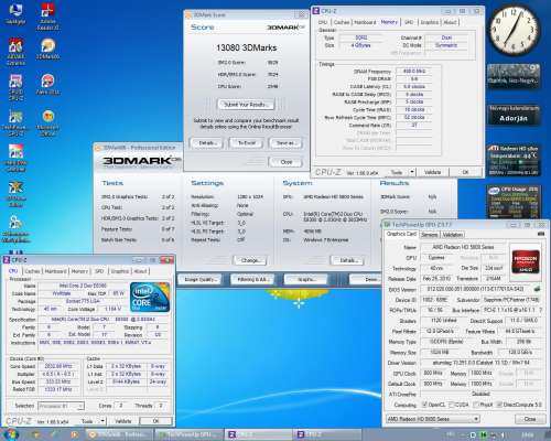 4. Screenshot készítése, melyen látszik az eredmény, két Cpu-z ablak, egyikben a processzor, másikban a memória (SPD és alaplap fül nem kell) és egy Gpu-z ablak. A shot-nál szintén látszódnia kell az összes részeredménynek! Pl.:1. Ehhez Advanced/Professional Edition szükséges vagy olyan Basic Edition, ahol a 3dmark.com-ra linkelt eredménynél látszik az összes részeredmény!